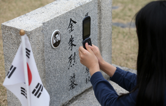 4·19민주화운동 기념일을 앞둔 16일 서울 강북구 국립 4·19민주묘지에서 한 학생이 김주열 열사 가묘의 비를 휴대전화로 촬영하고 있다.