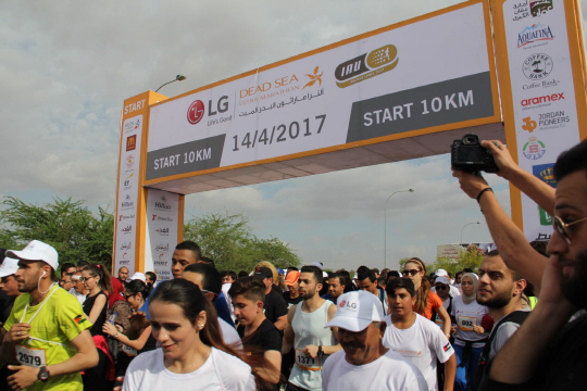 LG전자 등의 후원으로 14일 요르단 사해에서 열린 사해 마라톤대회에서 8600여 명의 참가자가 힘차게 출발하고 있다. LG전자는 이 대회 참가자 1명당 5달러씩을 국제적십자위원회(ICRC)에 기부할 예정이다.