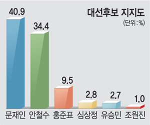 20일 문화일보 제19대 대선 후보 지지도 여론조사에서 문재인 더불어민주당 후보가 40.9%, 안철수 국민의당 후보가 34.4% 지지를 각각 얻은 것으로 나타났다. 문 후보가 6.5%포인트 차로 오차범위(±3.1%포인트)를 살짝 넘어 안 후보를 앞선 반면, 가상 양자 대결에서는 문 후보(44.8%)와 안 후보(44.4%)가 치열한 접전 양상을 보였다. 이는 문화일보가 공식 선거운동 초반인 지난 18∼19일 여론조사 전문기관 엠브레인에 의뢰해 전국 19세 이상 성인남녀 1054명을 상대로 조사한 결과다.