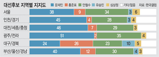 부산·울산·경남(PK)에서는 여전히 문 후보와 안 후보의 경쟁 구도가 지속되고 있다는 점에서 TK에서의 변화가 아직 여타 지역으로까지 확산됐다고 보기는 어려운 상황이다.