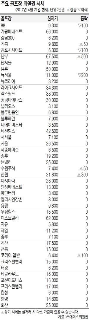 고가권에선 송추, 서원밸리가 강보합이나 화산은 상승세가 누그러지는 분위기다. 중가권에선 기흥과 코리아가 상승세를 유지하고 있으나 뉴서울과 88은 조정국면을 벗어나지 못했다. 저가권은 약보합세가 우세한 가운데 회생절차가 마무리단계에 이른 필로스가 급등했다. 지난해 최대 영업실적을 올린 파인크리크는 주주회원 배당을 결정하면서 강세를 보였다.