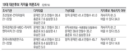 조선일보·칸타퍼블릭이 실시한 5자 대결 조사에서 문 후보는 37.5%, 안 후보는 26.4%, 지지율 차이가 11.1%포인트로 오차범위(±3.1%포인트) 밖으로 벌어졌다. 지난 7~8일 조사(문 35.7%, 안 37.5%)와 14~15일 조사(문 36.3%, 31.0%)에서는 두 후보 격차가 오차범위 내에 있었다. 이어 홍 후보 7.6%, 심상정 정의당 후보 3.3%, 유 후보 2.9%로 세 후보는 지난주에 비해 모두 1%포인트 이내에서 소폭 상승했다. 한국경제신문·MBC가 리서치앤리서치에 의뢰해 실시한 조사에서는 문 후보 39.1%, 안 후보 30.1%, 홍 후보 9.5%, 심 후보 4.1%, 유 후보 3.8%였다. 7~8일 조사에서 문 후보(35.2%)와 안 후보(34.5%)가 접전을 벌였던 점을 고려하면 격차가 벌어진 것을 알 수 있다. 같은 기간 홍 후보는 2.1%포인트, 유 후보는 1%포인트 상승해 안 후보의 중도·보수 지지층이 보수 정당 후보에게로 일부 이동했다는 분석이 나왔다. 다만 한국사회여론연구소(KSOI) 조사에서는 문 후보(44.4%)와 안 후보(32.5%)의 격차가 11.9%포인트로 지난 14~15일 조사(문 46.9%, 안 34.4%)에 비해 다소 줄어들었다.