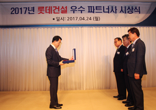 롯데건설은 최근 서울 송파구 잠실롯데호텔 에메랄드홀에서 ‘2017년 우수 파트너사 시상식’(사진)을 개최했다고 1일 밝혔다. 행사에는 50여 개 우수 및 주요 파트너사, 우수 안전사 대표 등이 참석했다. 이날 행사에서 롯데건설은 파트너사 정기평가를 통해 선정된 능원건설 등 3개사에 대해 ‘최우수 파트너사’상을 시상했다. 또 2017년 선정된 총 47개 우수 파트너사에 대한 시상식도 했다. 이 밖에 안전한 시공 및 건설에 공헌한 ㈜거흥산업 등 4개사에 대해 ‘우수 안전 파트너사’ 상을 주고, 금강가구㈜ 등 3개사에는 품질하자 평가 우수 실적 관련으로 C/S 상을 수여했다.