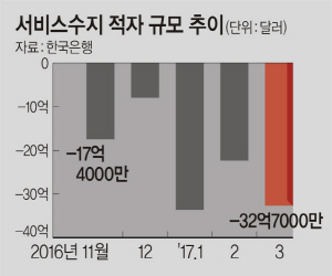 경상수지는 2012년 3월부터 61개월 연속 흑자를 기록하면서 사상 최장 기록을 다시 썼다. 하지만 3월 흑자는 서비스수지 적자 증가 영향으로 2월(84억 달러)보다 24억7000만 달러 감소했다. 상품수지 흑자는 98억 달러로 2월(105억5000만 달러)에 비해 7억5000만 달러 줄었다. 3월 서비스수지 적자는 32억7000만 달러로, 사상 최대를 기록했던 1월(33억6000만 달러)에 이어 역대 2위를 기록했다. 올 1분기 서비스수지 적자는 88억6000만 달러로 사상 최대 규모를 기록했다. 해운업 불황 여파로 3월 운송수지 적자가 6억2000만 달러로 집계돼 월간 사상 최대 적자를 기록했다.