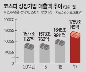 이 같은 기업의 매출 상승 기대감은 최근 수년간 통계에 비춰봤을 때 이례적이다. 한국거래소 자료를 보면 지난해 코스피 상장기업의 매출액은 전년 대비 0.80% 증가하는 데 그쳤다. 2015년에는 오히려 전년보다 매출액이 3.01% 뒷걸음치기도 했다.
