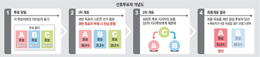 선호투표제의 가장 큰 특징은 선거에서 가장 많은 지지를 받은 후보를 선출하는 것뿐만 아니라 높은 지지도와 동시에 반감도도 높은 후보가 선출돼 선거 불복 등의 후유증이 발생하는 것을 막을 수 있다는 점이다. 선호투표제에서 각 후보의 선호순위를 집계하는 방법은 여러 가지가 있으나 가장 유명한 것은 IRV(Instant-runoff voting·즉시결선투표, 소선거구단기이양식투표)라고 불리는 방식이다. IRV에서는 각 개표 단계에서 득표수가 가장 적은 후보가 제외되고 해당 후보에게 투표한 사람의 표는 그 투표자가 2순위로 지지하는 후보에게 가산된다. 그리고 이런 과정을 한 후보가 과반 득표율을 획득할 때까지 반복하는 것이다. 프랑스 대선의 경우 1차 투표에서 과반수 득표자가 나오지 않을 경우 1차 투표의 1, 2위를 놓고 2차 투표를 치르는 결선투표제를 실시한다. 선호투표제는 한 번의 투표만으로 1차 투표와 결선투표를 동시에 치르는 효과를 낼 수 있다는 점에서 즉시결선투표라고도 불린다.