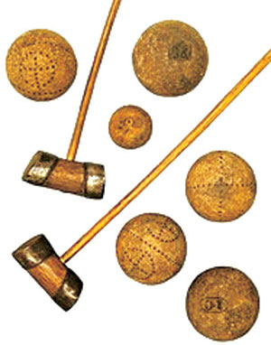 치는 방식은 골프와 같지만 나무 채의 헤드 면이 달랐다. 골프는 헤드 앞면으로 가격한다. 그런데 죄드마이는 망치를 사용하듯 둥글고 좁은 옆면으로 나무볼(아래)을 쳤다. 마치 절구통을 내려치는데, 옆으로 스윙하는 식이었다. 단단한 박달나무 등으로 만든 채에 맞으면 볼은 수백 야드가 족히 날아갔다.