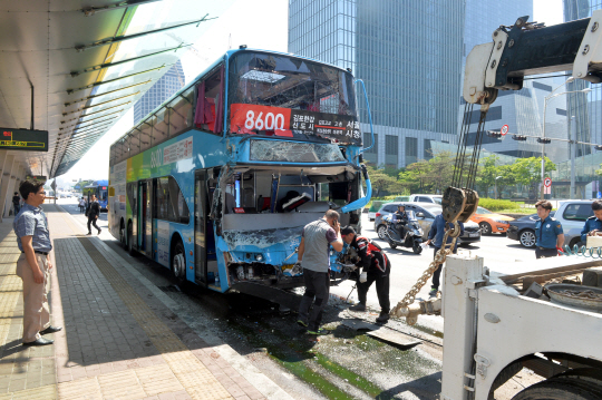 19일 오전 서울 영등포구 여의동 버스 환승센터에서 버스 3대가 추돌하는 사고가 발생해 견인업체 직원들이 사고 차량을 수습하고 있다.