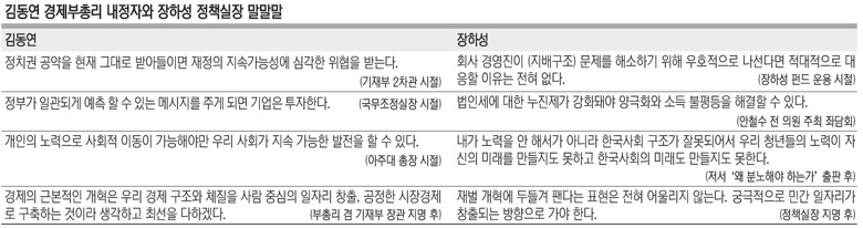 김동연 부총리 겸 기획재정부 장관 내정자와 장하성 정책실장의 그간 발언을 종합해 보면 ‘김동연+장하성’ 경제팀의 향후 경제 운용 방향을 가늠해 볼 수 있다. 김 내정자는 상고-야간대를 나온 대표적 ‘흙수저’, 장 실장은 장관급만 4명을 배출한 집안의 ‘금수저’ 출신으로 자라온 환경은 서로 다르지만, 두 사람 모두 사회적 약자 배려, 불평등 개선, 기득권 재생산 타파에 큰 관심을 두고 있다. 특권 의식이 적다는 점도 공통점이다. 김 내정자는 “첫 임용 때 받은 19.8㎝×4.5㎝짜리 이름만 달랑 적힌 명패를 공직생활 내내 사용했다”고 말하곤 한다. 장 실장도 집안 이야기가 나오면 “세상에서 제일 못난 사람이 자식·돈·집안 자랑하는 사람”이라고 말한다.