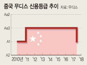 국제신용평가사 무디스가 중국의 금융 부문 취약성을 이유로 국가신용등급을 Aa3에서 A1으로 한 단계 강등했다. 등급 전망은 ‘안정적’으로 평가했다고 중국 경제 매체들이 24일 보도했다. A1은 한국(Aa2)보다 두 단계 아래 등급이다. 무디스가 중국의 신용등급을 낮추기는 6년 만에 처음이다.
