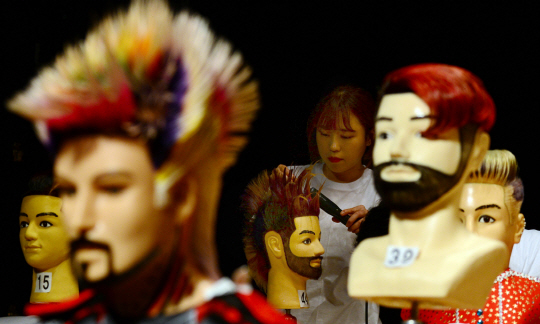 23일 부산 동구 부산시민회관 소극장에서 열린 ‘제9회 부산시장배 이용 기능 경기대회’에 참가한 이용인들이 머리 손질 솜씨를 뽐내고 있다.