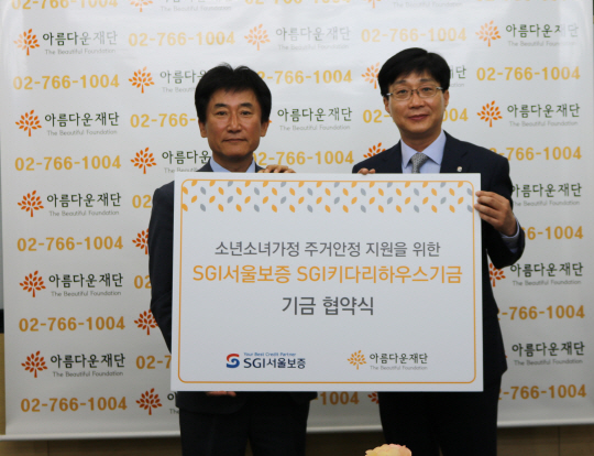 이득영(오른쪽) SGI서울보증 상무는 24일 서울 종로구 자하문로 아름다운재단에서 박종문 이사장에게 소년소녀가장 주거비 지원을 위한 기부금 5000만 원을 전달했다.