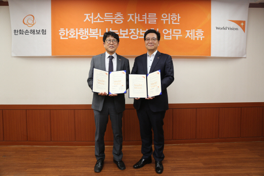 김태철(사진 오른쪽) 한화손해보험 장기보험부문장은 24일 서울 영등포구 여의동 월드비전 사옥에서 어호선 월드비전 마케팅부문장과 저소득층 자녀(4~19세 대상)를 위한 무료보험 업무제휴(MOU)를 맺었다. 이번 제휴를 시작으로 한화손보는 저소득층 자녀에게 3대 진단비(암·뇌·심장)와 상해·질병 입원비, 수술비 등을 무료로 보장하는 ‘기부보험’ 캠페인을 진행한다.