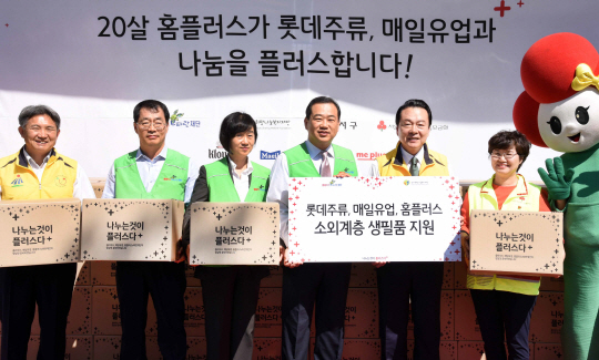홈플러스는 김상현(오른쪽 세 번째) 사장은 지난 24일 서울 등촌동 홈플러스 사옥에서 고건상(왼쪽) 강서희망나눔복지재단 이사장, 노현송(오른쪽 두 번째) 강서구청장 등이 참석한 가운데 소외계층 생필품 지원을 위한 ‘나눔플러스 박스’ 전달했다.