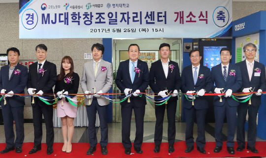유병진(가운데) 명지대 총장은 고용노동부 2017 대학창조일자리센터 운영대학으로 선정됨에 따라 25일 오후 3시 서울 서대문구 인문캠퍼스 행정동 3층 대회의실 및 1층 MJ대학창조일자리센터에서 ‘MJ대학창조일자리센터’ 개소식을 개최했다.