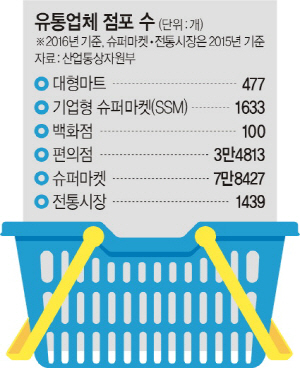 29일 관련 업계에 따르면, 2010년 11월 전통상업보존구역에 대한 출점 제한을 시작으로 지난해 초까지 대규모 점포에 대한 규제가 7건 이상 이어졌다. 또 국회에 입법 계류된 ‘유통산업 발전법’ 개정안만도 22건에 달한다. 주로 대규모 점포 등록제를 허가제로 전환, 대형마트 의무휴업일 확대, 복합쇼핑몰 의무휴업 등으로 전통시장과 골목상권을 보호하자는 취지다. 최근 공정거래위원회는 가맹, 유통, 대리점의 ‘갑질’ 행위 규제 차원에서 유통업 법에 징벌적 손배제까지 도입하겠다고 예고했다.