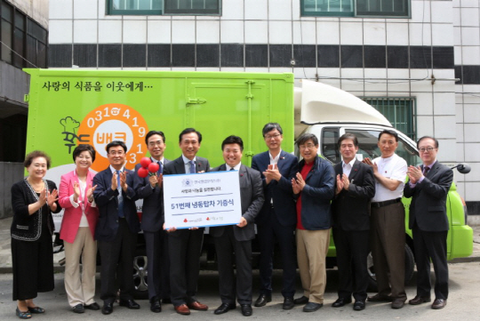김병철(왼쪽 다섯 번째) 한국필립모리스 전무는 31일 경기 안산시 상록구 안산 나눔과 기쁨 푸드뱅크를 찾아 라용주(〃여섯 번째) 대표에게 51번째 냉동탑차를 기증했다. 이 냉동탑차는 안산지역 어려운 가정에 도시락을 배달하는 ‘반찬 도시락 나눔’ 사업에 활용된다.