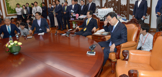 정세균(원탁 오른쪽 두 번째) 국회의장이 5일 오전 의장 집무실에서 자유한국당을 제외한 교섭단체 3당 원내대표와 만나 현안에 대해 의견을 나누고 있다. 왼쪽부터 김동철 국민의당, 우원식 더불어민주당 원내대표, 정 의장, 주호영 바른정당 원내대표. 원탁 오른쪽 첫 번째 자리는 정우택 자유한국당 원내대표가 이낙연 국무총리 임명동의안 처리 강행에 반발, 불참해 비어있다.