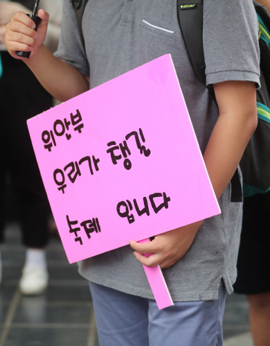한국정신대문제대책협의회 주최 ‘제1286차 일본군 성노예제 문제 해결을 위한 정기 수요시위’ 참가자가 7일 서울 종로구 옛 주한일본대사관 앞에서 ‘위안부 우리가 챙길 숙제입니다’라고 적힌 피켓을 들고 있다.