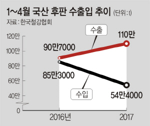 반면 가격경쟁력을 앞세워 해마다 급증하던 중국산 수입은 큰 폭으로 감소했다. 4월까지 중국산 후판 수입량은 지난해 61만3000t에서 39% 감소한 37만4000t에 그쳤다. 일본산 후판 수입 역시 33% 감소했다. 이 같은 수입 감소는 조선업 불황이 이어지면서 국내 후판 수요가 급감한 데다 중국산과 한국산 제품 가격 차가 좁혀졌기 때문으로 분석됐다. 실제 올 1분기 국내 후판 수요는 지난해보다 24% 감소한 142만t에 그쳤다.