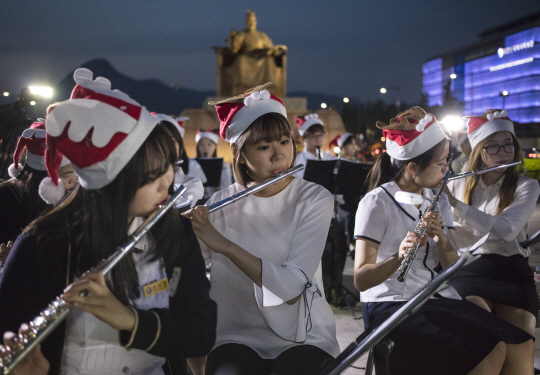 8일 밤 서울 광화문 광장에서 음악 봉사단체인 ‘메리 오케스트라’ 단원들이 달빛 아래 콘서트 공연을 하고 있다.