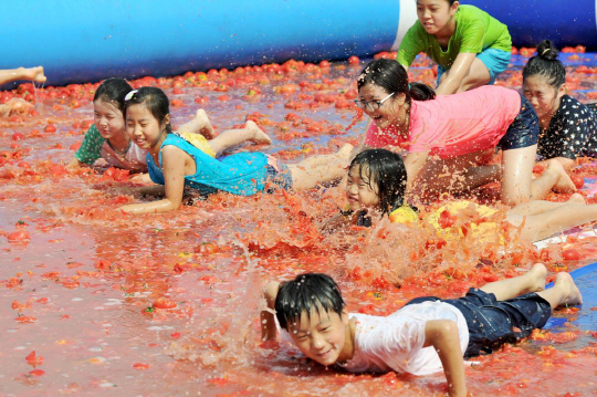 이번 축제의 캐치프레이즈는 ‘태양 빛 주렁주렁, 건강이 방울방울’이다. 작열하는 태양 아래 붉은빛을 더하며 영글어가는 퇴촌 토마토를 형상화했다는 게 시의 설명이다. 축제 프로그램 중에서는 토마토 풀장(사진)이 단연 인기 있다. 1만7000원의 입장료를 내면 자녀들과 함께 에어바운스 형태의 풀장에서 미끄럼도 타고 서로 토마토를 던지며 색다른 추억을 즐길 수 있다. 한 번에 30분간 최대 70명씩 입장객 수를 제한하고 있지만, 해마다 입장객은 증가하고 있다. 다채로운 토마토 음식도 축제의 즐거움을 더한다. 16일에는 토마토를 우려낸 육수와 열무로 맛을 낸 국수 시식회가 열리고, 17일에는 지난해 축제 요리경연대회 우승자들이 토마토를 소재로 이색적인 레시피를 선보이는 푸드 쇼가 준비돼 있다. 토마토 높이 쌓기, 막걸리 빨리 마시기 등 경연대회도 눈길을 끈다. 작물을 직접 수확해볼 수 있는 체험 행사와 글짓기, 사생대회도 열린다.