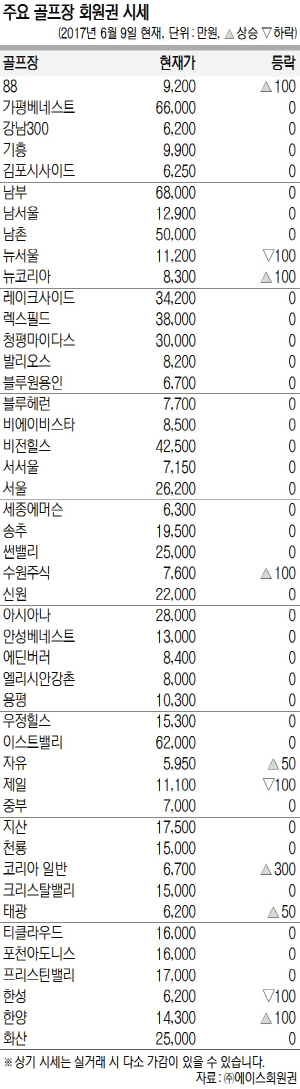 중가권 중 코리아가 급등했고 수원도 강세를 보이면서 관심을 끌었다. 저가권에선 그린피 인상으로 회원들과 마찰을 빚고 있는 그랜드가 하락 중이며 도고, 여주가 동호회 매수주문에 힘입어 상승하고 있다.