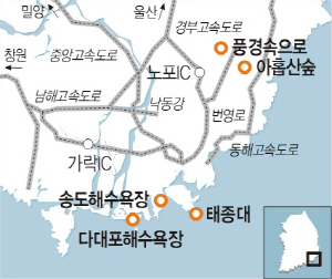 가는 길 = 송도해수욕장은 부산 구도심과 가깝다. 부산역에서 버스를 타면 30분이 채 안 걸린다. 태종대는 영도의 최남단에 있다. 태종대 산책로에는 전기차 다누비가 운행한다. 한 번 티켓을 사면 원하는 곳에서 내리고 재탑승할 수 있다. 다대포해수욕장은 부산지하철 1호선 역이 생겨 찾아가기가 한결 수월해졌다. 아홉산 숲은 대중교통으로 찾아가기엔 불편하다. 해운대에서 아홉산 숲까지는 차로 30∼40분 정도다.