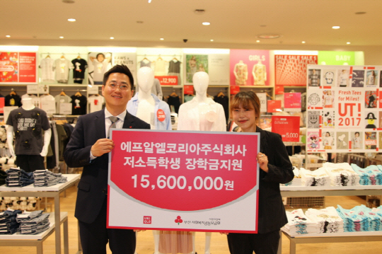 김은지(오른쪽) 유니클로 부산 롯데백화점 광복점 점장은 27일 박은덕 부산사회복지공동모금회 사무처장에게 부산지역 중·고교생을 위해 써달라며 장학금 1560만 원과 기능성 내의를 전달했다.