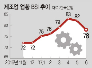 29일 한국은행이 발표한 6월 기업경기실사지수(BSI)에 따르면 이달 제조업 업황 BSI는 78로 지난달보다 4포인트 하락했다. 제조업 업황 BSI는 올 들어 4월까지 4개월 연속 상승세를 보인 후 5월 들어 83에서 82로 떨어진 뒤 두 달 연속 내림세를 보였다.
