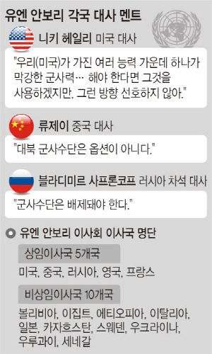 이날 회의장에는 시종일관 긴장감이 감돌았다. 류제이(劉結一) 유엔 주재 중국 대사는 헤일리 대사에 맞서 중국의 해법인 쌍중단(雙中斷, 북한 핵·미사일 도발과 한·미 연합군사훈련 중단)을 거듭 강조했고 블라디미르 사프론코프 러시아 차석대사도 의견을 함께하면서 힘을 보탰다.