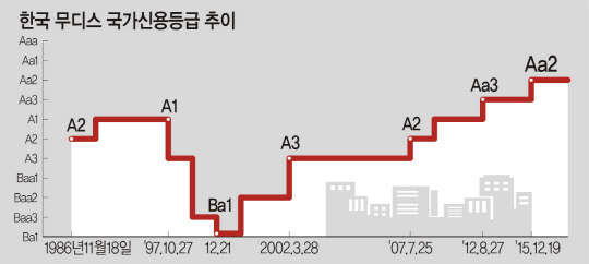 우리나라의 국가신용등급은 2015년 12월 19일 사상 최고 등급(전체 21개 등급 중 세 번째)인 ‘Aa2(등급 전망 안정적)’로 상향 조정된 뒤 1년 7개월째 제자리걸음을 하고 있다.