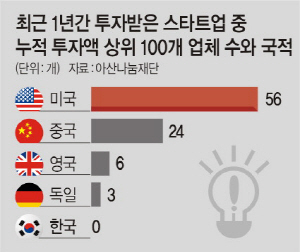 세계 100대 스타트업 가운데 한국 업체는 단 1곳에 그친 것으로 나타났다. 이와 함께 투자액 상위 100개 업체의 사업 모델 중 누적투자액 기준 70%의 사업이 국내에서는 규제에 저촉될 가능성이 큰 것으로 나타났다.