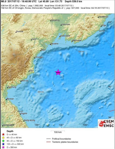 당시 진앙은 북한 청진 남서쪽 84㎞ 부근이었고 진원의 깊이는 0㎞였다.