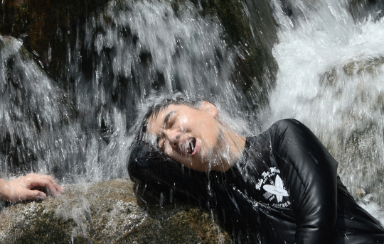 19일 경기 과천시 중앙동 향교 계곡에서 한 시민이 쏟아지는 물줄기를 맞으며 더위를 식히고 있다.