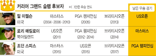 현재 PGA투어에서 활동 중인 선수 중 각기 다른 3개의 메이저대회에서 우승해 커리어 그랜드슬램에 도전하는 선수는 스피스 외에 필 미켈슨(47·미국)과 로리 매킬로이(28·북아일랜드) 정도이다. 남자 골프에서 커리어 그랜드슬램은 시즌에 상관없이 4대 메이저대회(마스터스·US오픈·브리티시오픈·PGA챔피언십)에서 모두 우승을 차지하는 것을 뜻한다. 한 해에 4대 메이저를 석권한 보비 존스(미국·1930년)를 포함해도 지금까지 커리어 그랜드슬램을 달성한 골퍼는 6명뿐이다. 진 사라센(미국·1935년), 벤 호건(미국·1953년), 게리 플레이어(남아프리카공화국·1965년), 잭 니클라우스(미국·1966년), 타이거 우즈(미국·2000년)가 전부다.