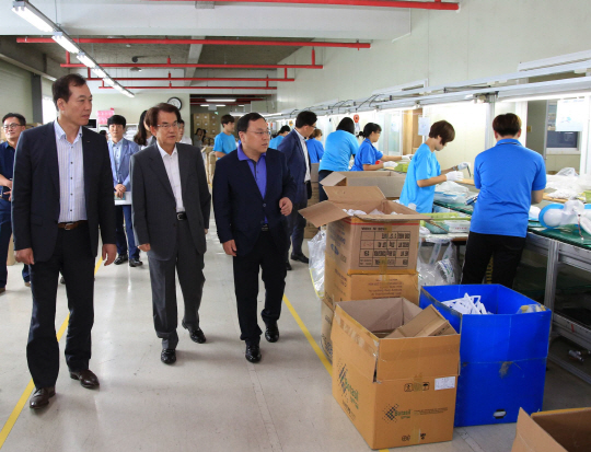 롯데홈쇼핑은 이완신(왼쪽) 대표와 강철규(〃 두 번째) 경영투명성위원회 위원장이 현장 경영을 통한 파트너사와의 협력 강화를 위해 지난 21일 파트너사인 ㈜오토싱을 방문, 생산 라인을 둘러보며 협력 방안을 논의했다고 24일 밝혔다.