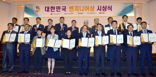 31일 서울 서초구 양재동 더케이호텔에서 열린 2017년 상반기 대한민국 엔지니어상 시상식에서 이용식(뒷줄 왼쪽 네번째) 문화일보 논설주간 등 시상자와 수상자들이 기념사진을 찍고 있다. 수상자 오성진(뒷줄 왼쪽 첫 번째) ㈜효성 부장, 최송(〃두 번째) 엘지전자㈜ 연구위원, 임옥동(〃오른쪽 세 번째) ㈜오토젠 수석연구원, 김상겸(〃두 번째) ㈜엘에스전선 수석연구원, 한민진(〃첫 번째) ㈜테키스트 부장, 아랫줄 왼쪽부터 한현식 ㈜희성촉매 부사장, 인유섬 ㈜보금 대표이사, 김화자 ㈜엘엠에이치코리아 대표이사, 설영실 한국전력기술㈜ 처장, 전옥화 코오롱인더스트리㈜ 수석연구원, 신요섭 ㈜윈앤텍코리아 대표이사, 안성철 현대자동차㈜ 책임연구원, 박종국 ㈜우진 차장, 박정열 ㈜대동이엔지 대표이사, 이명학 ㈜포스콤 부장.