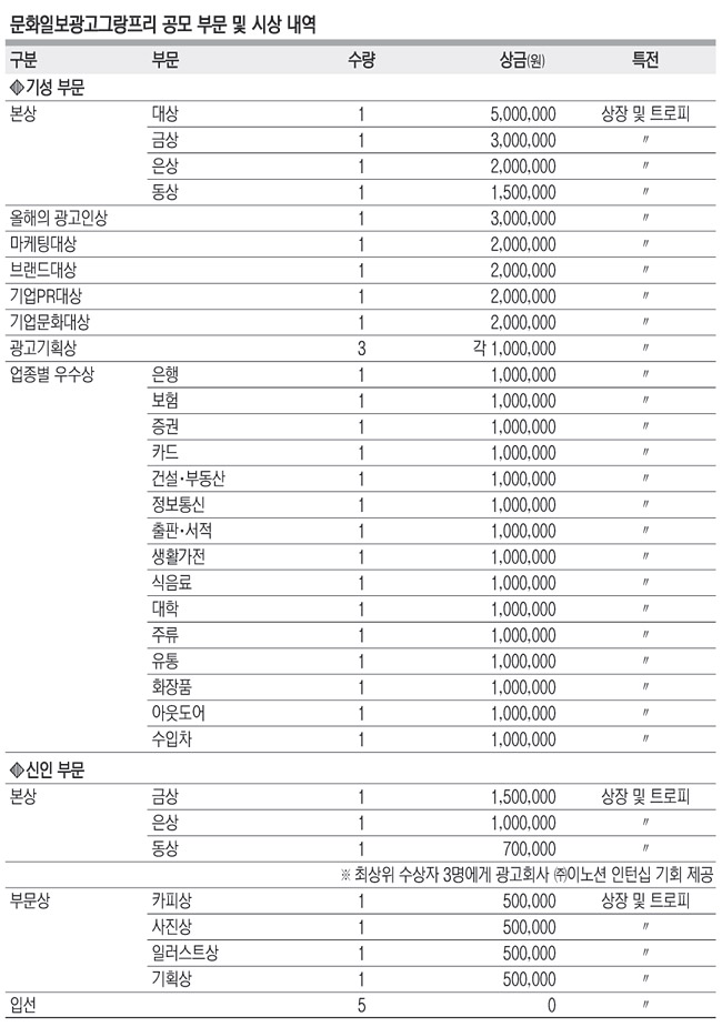 ② 응모 방법 : 5단 37㎝ 이상(1단=3.4㎝)의 컬러 또는 흑백광고. 광고주는 출품 기간 동안 본지에 ‘문화광고그랑프리 출품작’을 명시하여 게재.