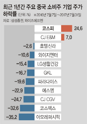 3일 삼성증권과 금융정보제공업체인 와이즈에프엔에 따르면 현재 국내 증시에 상장돼있는 10대 핵심 중국 소비재 기업 중 아모레퍼시픽이 최대 35.2% 하락하는 등 해당 기업들은 실적 뿐만 아니라, 주가 면에서도 큰 충격을 받은 것으로 조사됐다. 특히 화장품 업종인 아모레퍼시픽과 코스맥스(32.6%)가 30%대 하락률을 기록하며 가장 손실이 큰 것으로 나타났으며 이어 CJ CGV(-24.7%), 에스엠(-22.9%), 파라다이스(-19.6%), GKL(-16.7%), LG생활건강(-15.4%), 와이지엔터(-10.6%) 등도 10% 이상 주가가 떨어졌다. 이들 10대 기업의 주가가 평균 24% 하락하는 동안 코스피는 24.6% 상승, 대조를 이뤘다.