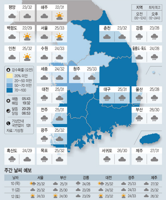 충청 남부와 남부지역·제주에는 오후까지, 강원 영동에는 밤까지 비가 내리겠다. 예상 강수량은 전남 해안·경남 남해안·제주가 30~80㎜(많은 곳 120㎜ 이상), 강원 영동·전라(전남 해안 제외)·경남(남해안 제외)·경북 남부가 20~60㎜ 되겠다. 아침 최저기온은 21도에서 26도, 낮 최고기온은 27도에서 33도 되겠다.