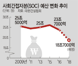 이에 따라 건설협회 등은 정부와 국회 등에 SOC 예산 감축 반대 목소리를 내고 있지만 ‘예산 원상회복’은 물 건너가는 분위기다. 내년 SOC 예산 감축안이 확정되면 10년 만에 최저치를 기록하게 된다. SOC 예산은 2009년 25조5000억 원, 2011년 24조4000억 원, 2013년 25조 원, 2015년 26조1000억 원, 2016년 23조7000억 원, 올해 21조8000억 원이 투입됐다.