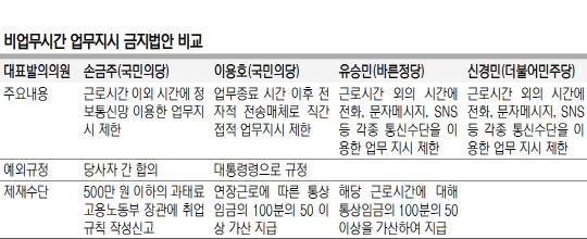 앞서 같은 당 이용호 의원, 유승민 바른정당 의원이 발의한 근로기준법 개정안도 비업무시간 업무지시를 제한하는 내용을 담고 있다. 이들이 대표발의한 법안은 퇴근 후 업무지시를 사실상의 연장근로로 보고, 이에 대해 통상임금의 100분의 50 이상을 가산해 지급하도록 했다. 신경민 더불어민주당 의원이 2016년 발의한 근로기준법 개정안은 비업무시간 업무지시를 제한하는 선언적 의미를 담았으며, 별도의 제재 방법은 규정하고 있지 않다.