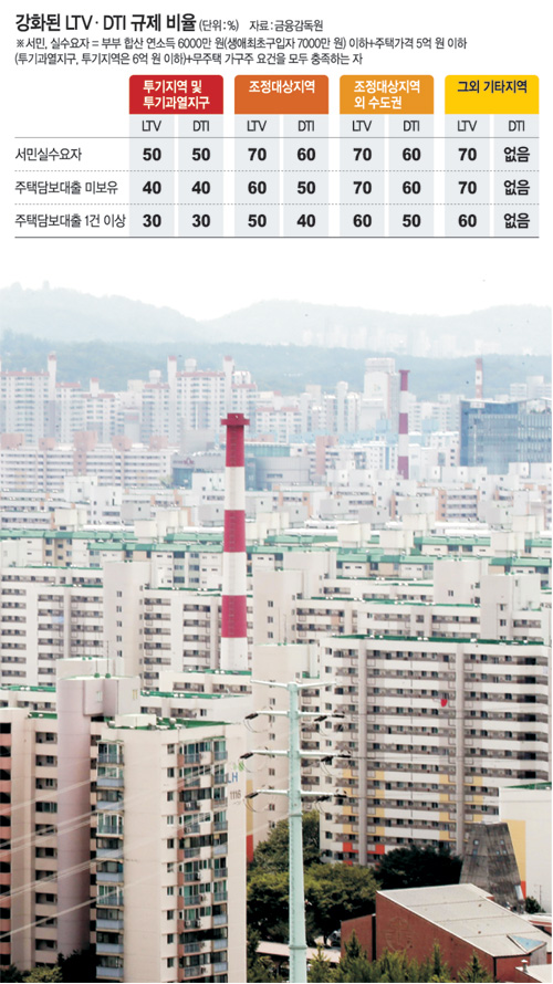 “어느 지역에 집을 사는지, 기존 주담대가 있는지에 따라 결정된다. 정부가 전국을 △투기지역 △투기과열지구 △청약조정대상 지역 △그 외 수도권과 지방으로 나눠 다른 대출 규제를 적용하고 있기 때문이다. 주담대가 없는 가구를 기준으로 △그 외 수도권과 지방은 주택담보인정비율(LTV)과 총부채상환비율(DTI)이 종전대로 70%·60%(지방은 DTI 없음) 적용받지만 △청약조정대상 지역(60%·50%) △투기과열지구·투기지역(40%·40%) 순으로 적용 비율이 낮아진다. 가장 규제 강도가 높은 투기지역의 경우 기존에 주담대가 있으면 추가 대출을 받을 수 없다. 아니면 2년 내에 기존 주담대를 받아 산 집을 판다고 은행에 약정서를 내야 한다. 그러면 LTV·DTI를 각 30%씩 적용받을 수 있다. 기존 주담대를 모두 상환한 뒤 대출을 받게 되면 LTV·DTI는 각 40%씩 적용된다.”