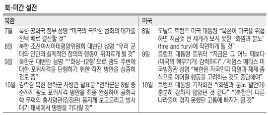 도널드 트럼프 미국 대통령이 휴가 중에 기자회견을 열고 북한에 대한 발언 수위를 더욱 높인 것은 북한의 괌 포위사격 위협 등 벼랑 끝 전술에 말려들지 않겠다는 의지를 내비친 것으로 해석된다. 다만 트럼프 대통령이 선제타격을 포함한 군사 옵션 사용을 배제하지 않음에 따라 ‘한반도 8∼9월 위기설’이 현실화하는 게 아니냐는 우려가 커지고 있다.