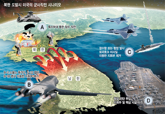 이에 따라 북한이 괌에 대한 도발 움직임을 보일 경우 미국이 실제 군사적 행동에 들어갈 가능성도 고개를 들고 있다. 미국이 군사 작전에 나설 경우 김정은 노동당 위원장 등 수뇌부에 대한 참수작전이나 북한 지휘부 및 핵·미사일 등 핵심 시설에 대한 정밀 타격이 이뤄질 것으로 군사전문가들은 보고 있다.