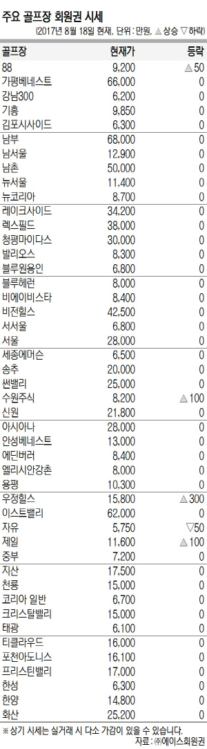 회원권 시장이 강보합세이다. 무더위 기세가 약화하고 휴가시즌이 마무리되면서 점진적인 매수주문이 시장 내로 유입되고 있는 양상이다. 초고가권에선 가을시즌을 앞두고 무기명회원권 수요가 증가하면서 BA 비스타와 여자골프대회가 치러지는 더 스타 휴에 대한 반응이 양호한 편이다. 고가권은 전반적인 보합세 기조에서도 서울과 송추가 대기수요의 영향으로 강보합세다. 중가권은 수급여건에 따라 종목별 차별화가 두드러졌다. 이로 인해 88과 제일이 상승했고 자유는 매수주문 부재로 하락했다.