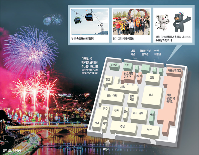 ◇‘한반도형’ 행사장 배치=킨텍스 제1전시장은 지자체 전시관, 지방 공공기관 전시관, 행안부 전시관, 특별관으로 분리해 조성된다. 지자체 홍보관은 대한민국 지도 형태에 맞춰 지자체별 참여 규모를 고려해 배치할 예정이다. 지자체 전시관에선 17개 시·도 및 131개 시·군·구 자치단체들이 지역경제 활성화 우수사례 및 성과를 다른 자치단체와 공유하는 자리가 될 전망이다.