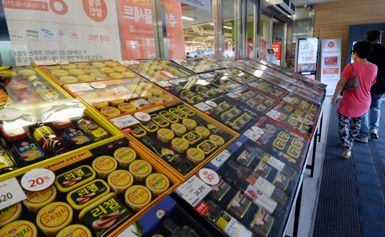 20일 서울 마포구의 한 대형마트를 찾은 손님들이 추석(10월4일) 대목을 앞두고 미리 진열된 선물세트를 보며 지나가고 있다.