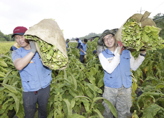 KT&G 임직원들이 지난 18일 충남 천안시 성남면 잎담배 산지에서 잎담배 수확 봉사활동을 하고 있다.
